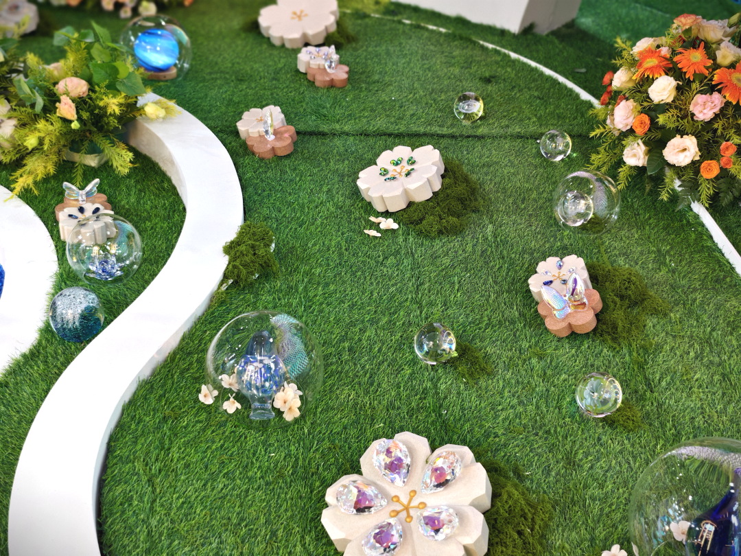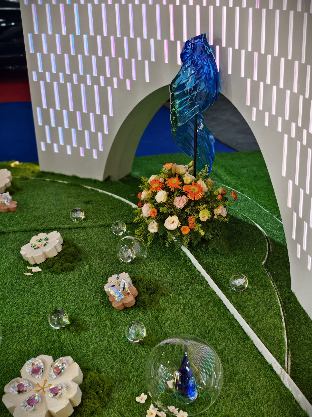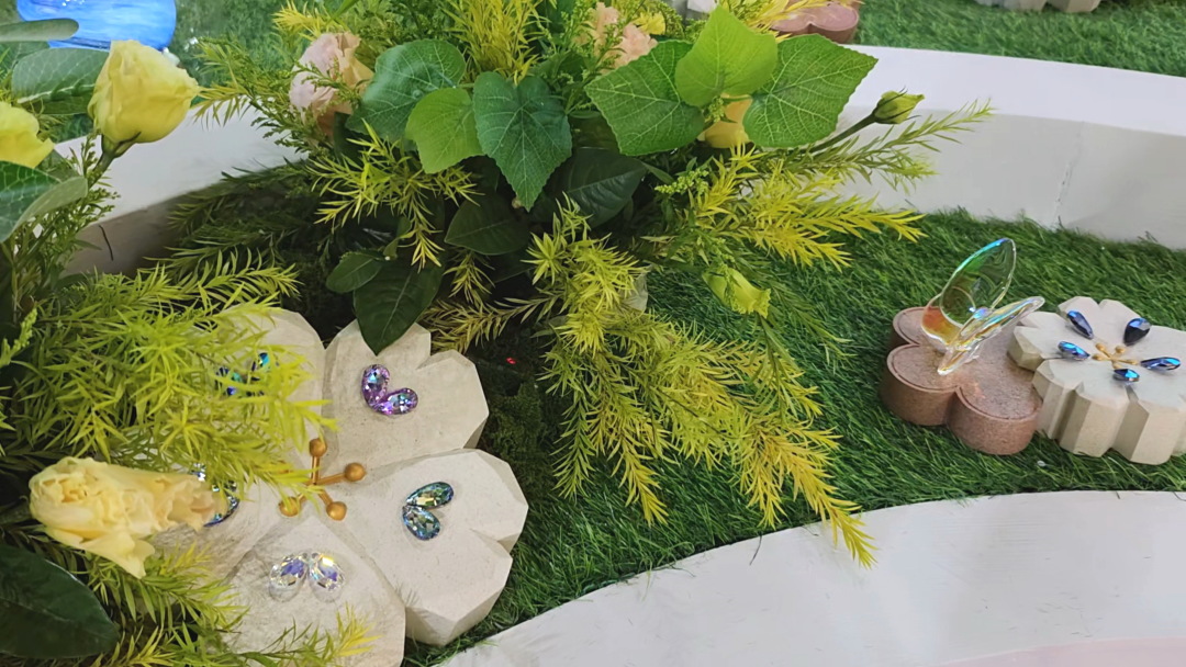 将晶石雕琢成花朵形状,细细嵌入温润石材之中。晶石花瓣通透如凝露,与石材的沉稳相得益彰。无论是安置在室内的静谧角落,还是立于室外的自然之间,都似有一抹晶莹的“花”在此长久绽放,诉说着生命的故事。