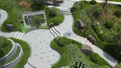 归心里巧妙借用中国古典园林“筑山、理水、叠石”的智慧,进行现代转译。尊重原有10%的缓坡地形,通过精巧的台地处理,让行走其间充满起伏的韵律。
